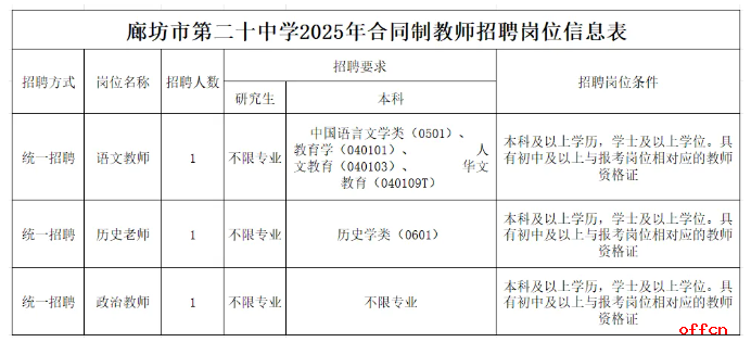 原标题:廊坊市第二十中学2025年合同制教师招聘公告