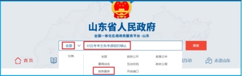 (二)在网站首页的搜索框左侧点击“全部”,从“分类”中选择“政务服务”,在文本框中输入“对自考考生免考课程的确认”,点击“搜索”后,从搜索结果中找到如下页面。