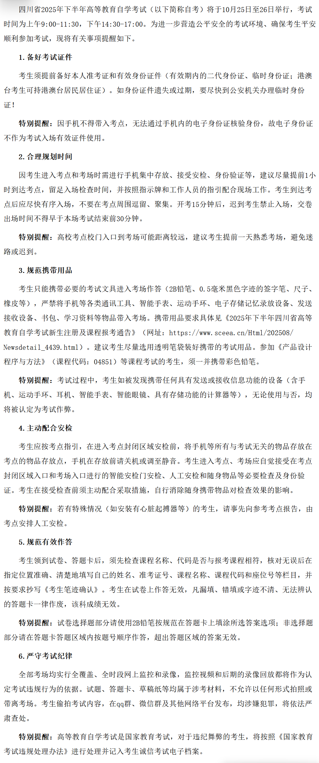 关于参加四川省2025年下半年高等教育自学考试的温馨提醒
