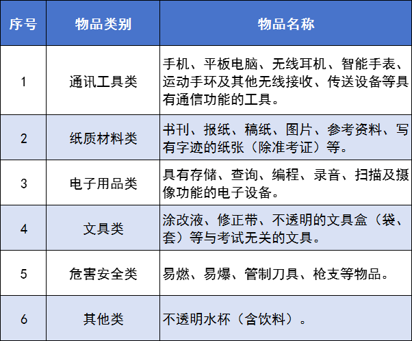 请考生准备好考试需要的相关文具,如2B铅笔、黑色字迹的钢笔或签字笔、马克笔、直尺、三角板、圆规、橡皮擦等,除必要文具之外任何物品不准带入考场(《国家高等教育自学考试违规物品种类清单》见下表)。严禁携带任何通讯工具(如手机、对讲机及其他无线接收、传送设备)、智能手表、运动手环、电子记事本、电子存储记忆录放设备、照相机、涂改液、修正带等与考试无关的物品进入考场。