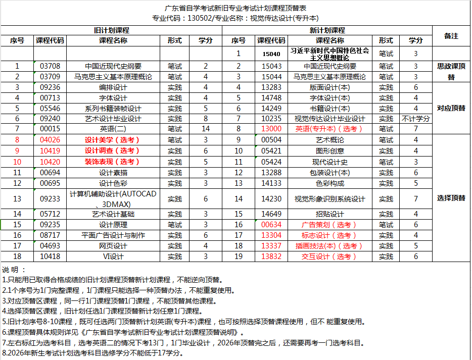 2026广东省自考【视觉传达设计】本科新旧专业考试计划课程顶替表