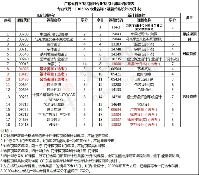 随着 2026 年广东自考新政落地,广东自考视觉传达设计专业的考试科目和顶替规则迎来关键调整。不少考生被 “新计划”“旧成绩”“顶替关系” 绕得晕头转向,生怕错过政策窗口或浪费之前的考试成果。今天直接上干货 —— 整理好 2026 年最新考试科目表、课程顶替表。