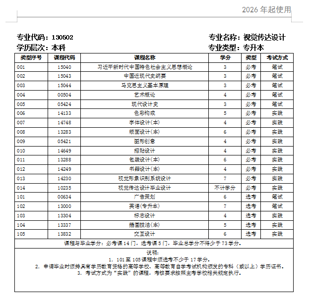 广东自考视觉传达设计(本科,专业代码 130502)属于小自考专业,2026 年 1 月起正式启用新考试计划,科目分为 “必考课”“选考课” 两类,且明确区分笔试与实践考核,整体要求更规范。