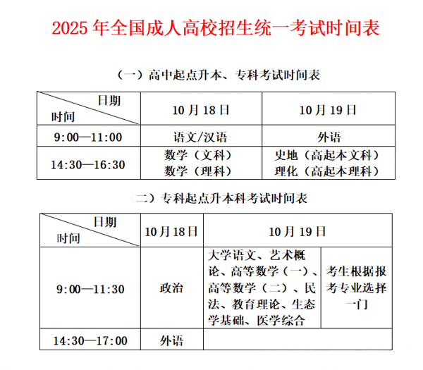 此处一般是考生所报考层次各科目的考试时间。其中高中起点升本科的考生须参加4个科目的考试,其他层次的考生是参加3个科目的考试。