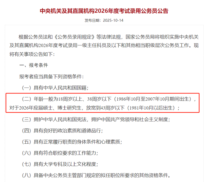 据《中央机关及其直属机构2026年度考试录用公务员公告》,报考年龄条件为,年龄一般为18周岁以上、38周岁以下(1986年10月至2007年10月期间出生),对于2026年应届硕士、博士研究生,放宽到43周岁以下(1981年10月以后出生)。