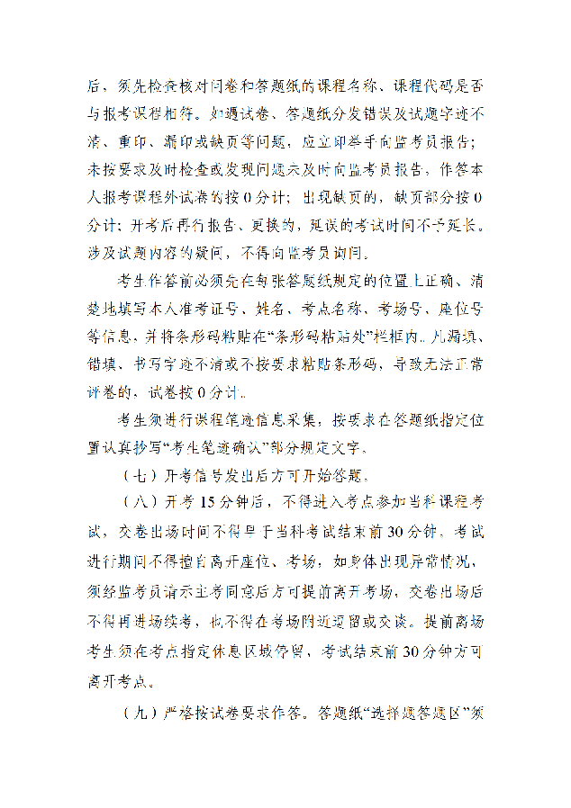 3.落实笔迹信息采集要求。考生须进行课程笔迹信息采集,按要求在答题纸指定位置认真抄写“考生笔迹确认”部分规定文字,按教育部有关规定,未进行笔迹采集的课程合格成绩将无法转出外省。已到考生须在点名卡对应签名框内签名确认。