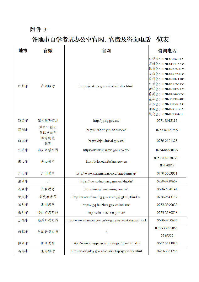 3.各地市自学考试办公室官网、官微及咨询电话一览表