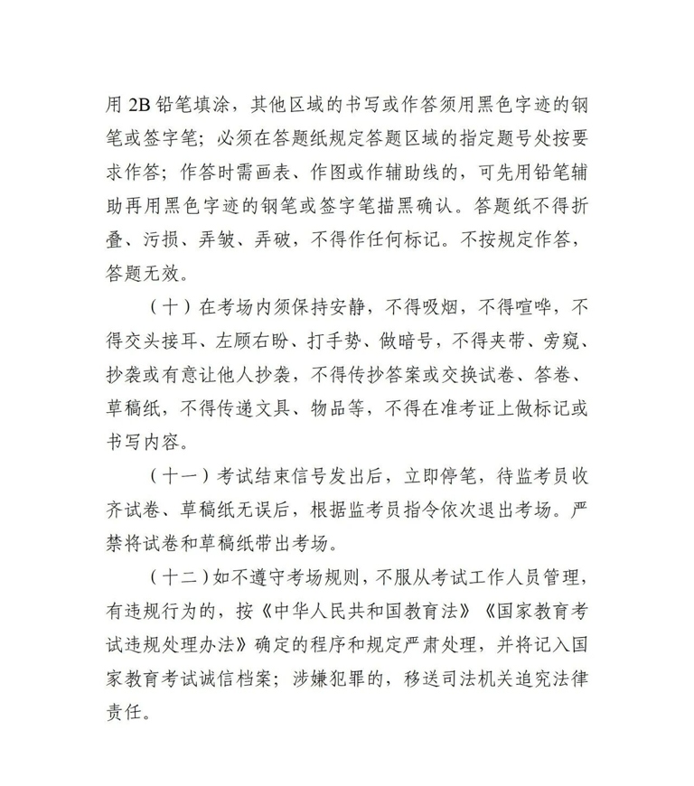考生须严格遵守有关法律、法规和考试有关规定,诚信考试。如有违规行为,一经查实,将根据《国家教育考试违规处理办法》(教育部令第33号)等规定严肃处理,并记入国家教育考试诚信档案。有组织作弊、提供作弊器材或者其他帮助的;向他人非法出售或者提供考试试题及答案的;代替他人或者让他人代替自己参加考试等行为的,将根据《中华人民共和国刑法》规定追究相关人员法律责任。