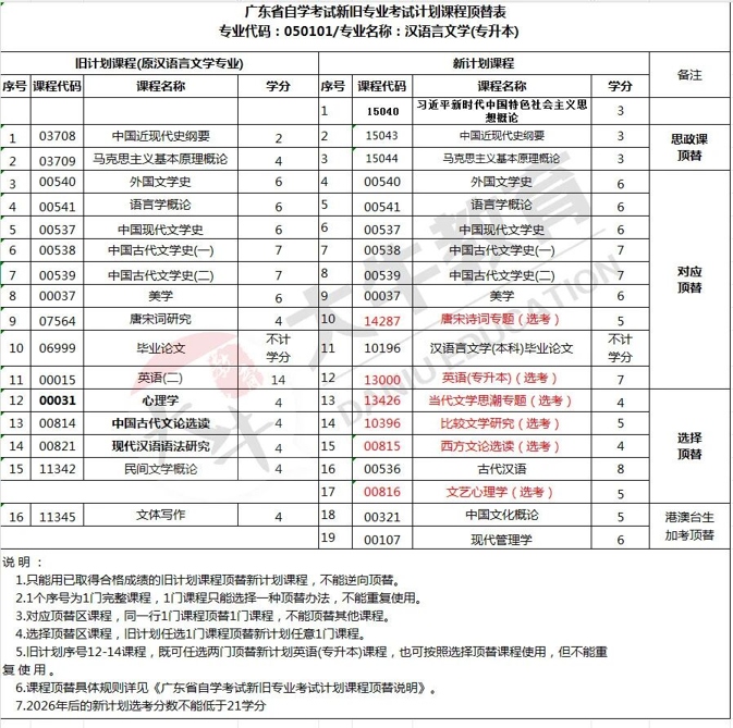 广东2026年自考汉语言文学本科考试计划&新旧课程顶替方案