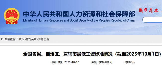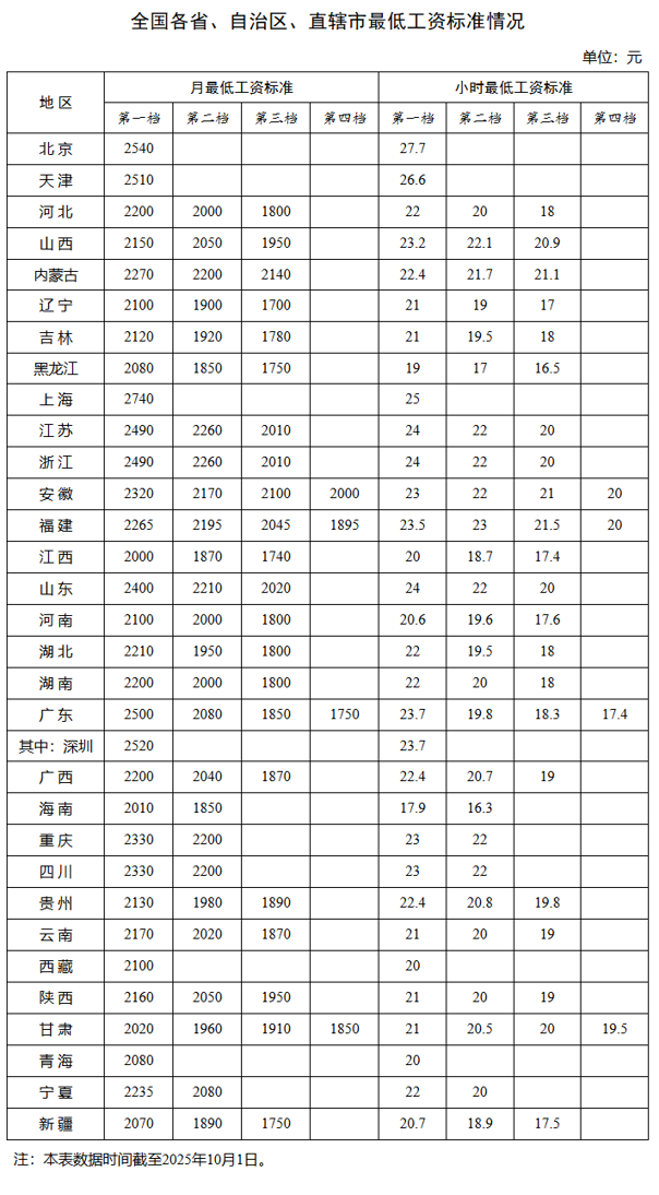 人社部最新公布:最低工资标准(截至2025年10月1日)
