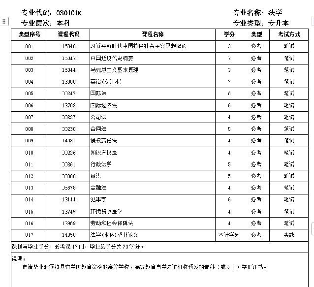 开考课程:《习近平新时代中国特色社会主义思想概论》《中国近现代史纲要》《马克思主义基本原理概论》《英语(专升本)》《国际法》《国际经济法》《公司法》《合同法》《侵权责任法》《知识产权法》《行政法学》《商法》《金融法》《犯罪学》《环境资源法学》《劳动和社会保障法》《法学(本科)毕业论文》