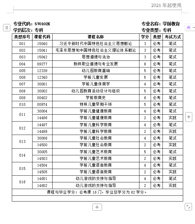 学前教育本科/专科考试计划