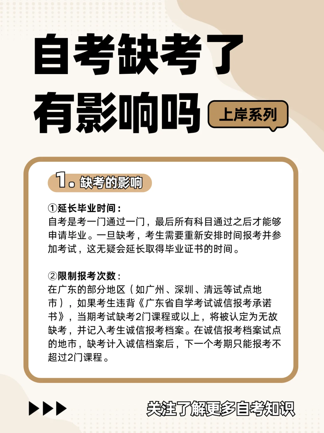 广东自考缺考不会对毕业造成影响,但会限制考生下一次报考的次数,最多只能考两门。缺考也会被记录,需要申请档案修复。广东自考通过率约为30%,需要投入大量时间和精力自学,并依赖个人的自学能力和自制力。